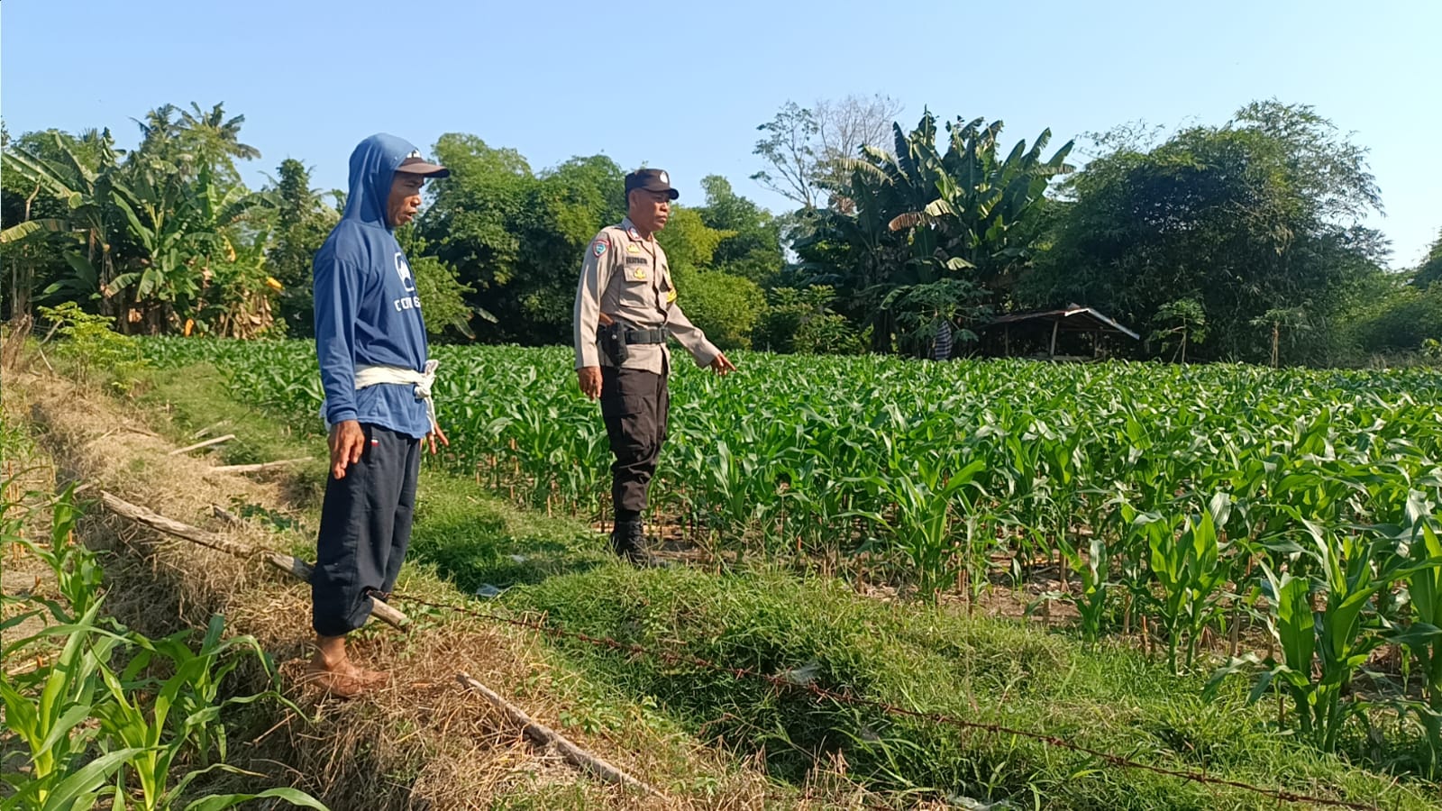 Kegiatan monitoring terbaru dilaksanakan pada Rabu, 8 Oktober 2025, pukul 10.35 WITA. Bhabinkamtibmas, melaksanakan sambang sekaligus pengecekan langsung di sawah Kecamatan Buer. Pemilik lahan, Bapak I, tengah menanam jagung tahap kedua yang kini baru berumur 35 hari.