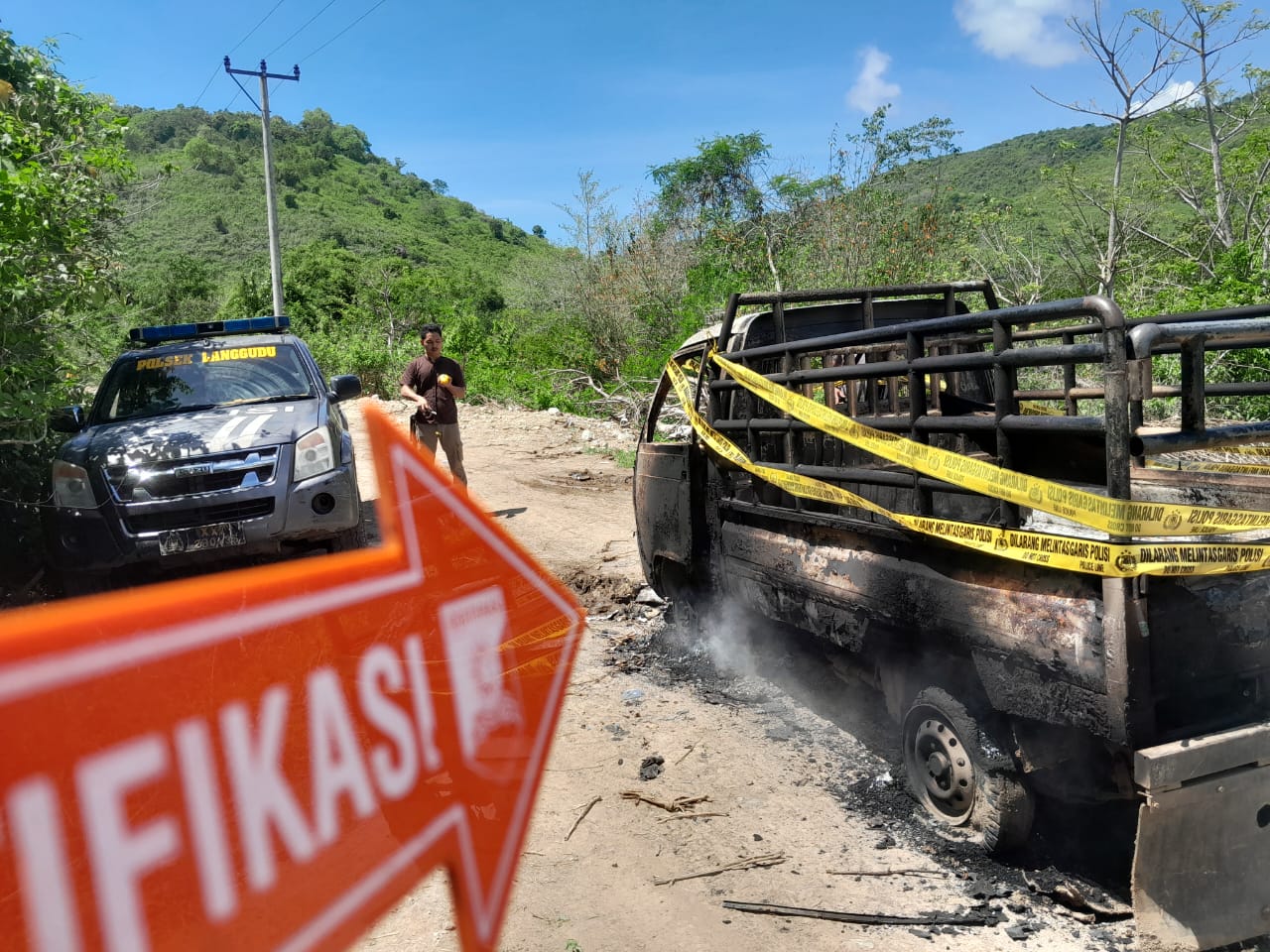 Menerima informasi pembakaran mobil, personel Polsek Langgudu langsung menuju lokasi untuk mengamankan TKP dan memastikan situasi tetap kondusif. Namun perjalanan menuju TKP memakan waktu sekitar dua jam, karena lokasi berada di wilayah seberang dengan akses jalan yang cukup sulit untuk dilalui kendaraan roda empat.